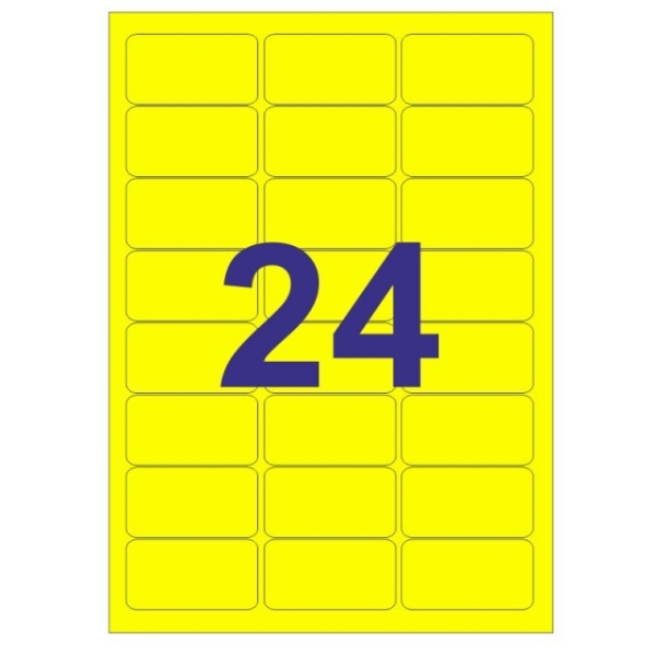 Etiquetas amarillo flúor cantos romos tamaño 64,0 x 33,9 mm con adhesivo permanente. Pack con 20 hojas (480 etiquetas). Estas etiquetas adhesivas de colores con acabado flúor son imprescindibles si quieres destacar un objeto, resaltar una información relevante o marcar un envío. Excelente calidad de impresión en impresoras láser o fotocopiadoras. Descarga el software gratuito para diseñar e imprimir todo tipo de etiquetas en www.apli.com