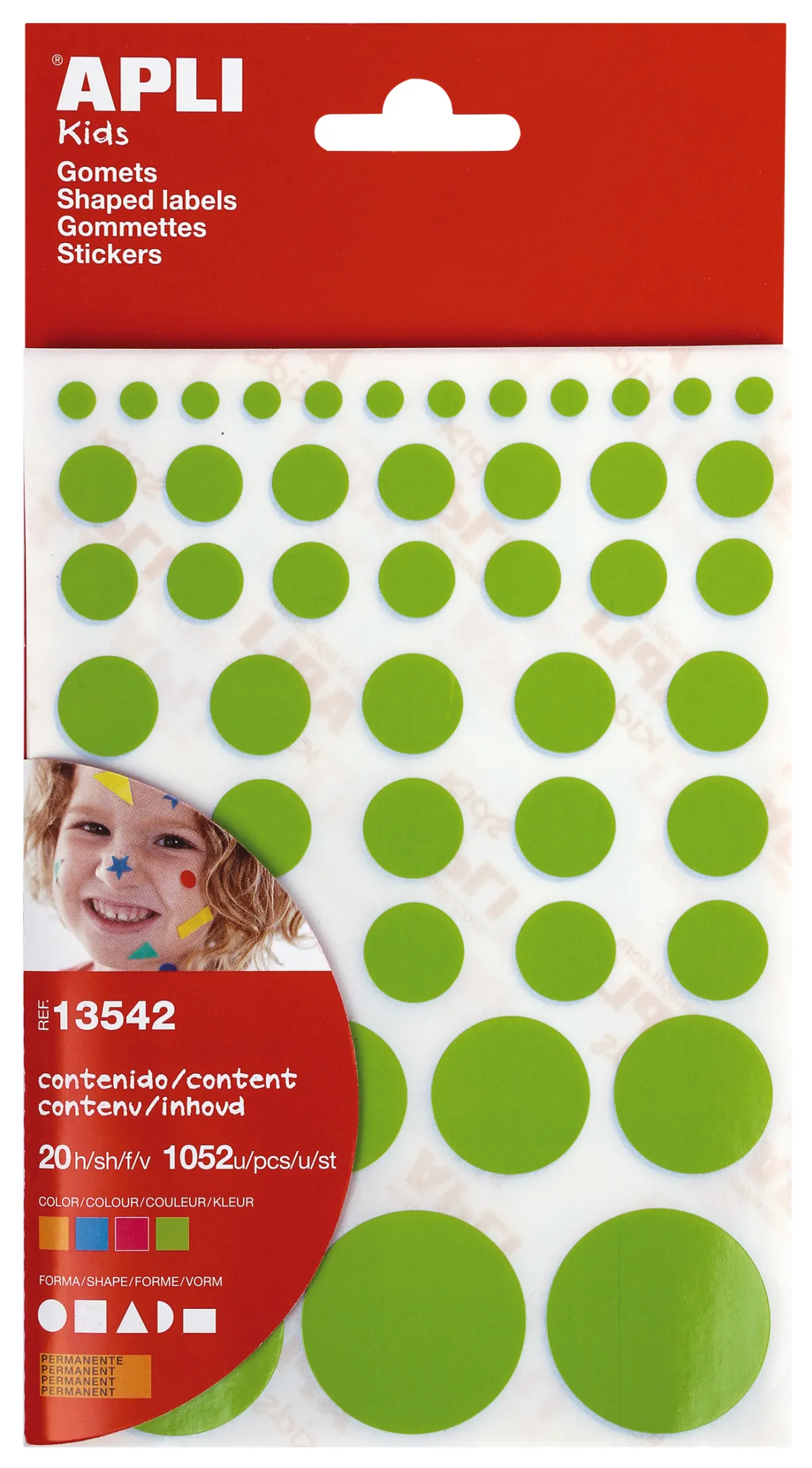 La bolsa de gomets de adhesivo permanente es un producto indispensable en cualquier hogar y escuela. Con diferentes colores, formas y tamaños, cada bolsa contiene 20 hojas con gomets surtidos, un total de 1.052 gomets por bolsa. Los gomets son una herramienta básica para que los niños se inicien en el mundo de los colores y las formas, desarrollando la psicomotricidad fina y trabajando varias capacidades y habilidades. Además, los gomets APLI cumplen con las más estrictas normas de calidad y seguridad.