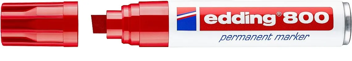 Marcador permanente para marcar y etiquetar con trazo grueso sobre casi todos los materiales, p. ej., papel, cartón, metal, vidrio, plástico y madera. El grosor de trazo de la punta biselada es de 4-12 mm. Resistencia al agua y al roce sobre casi todas las superficies. Artículo disponible en los colores negro, rojo, azul, verde, amarillo, naranja y marrón. El producto es rellenable con la tinta de recarga edding T 25, T 100 y T 1000. Contamos con puntas de recambio adecuadas (edding 800 puntas de recambio). Tinta casi inodora y sin adición de tolueno o xileno. Cuerpo de aluminio de alta calidad.