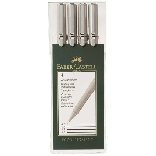Faber-Castell Ecco Pigment Pack De 4 Rotuladores Calibrados 0.1, 0.3, 0.5, 0.7Mm - Punta Engastada En Metal - Tinta Pigmentada Resistente Al Agua Y A La Luz - Color Negro