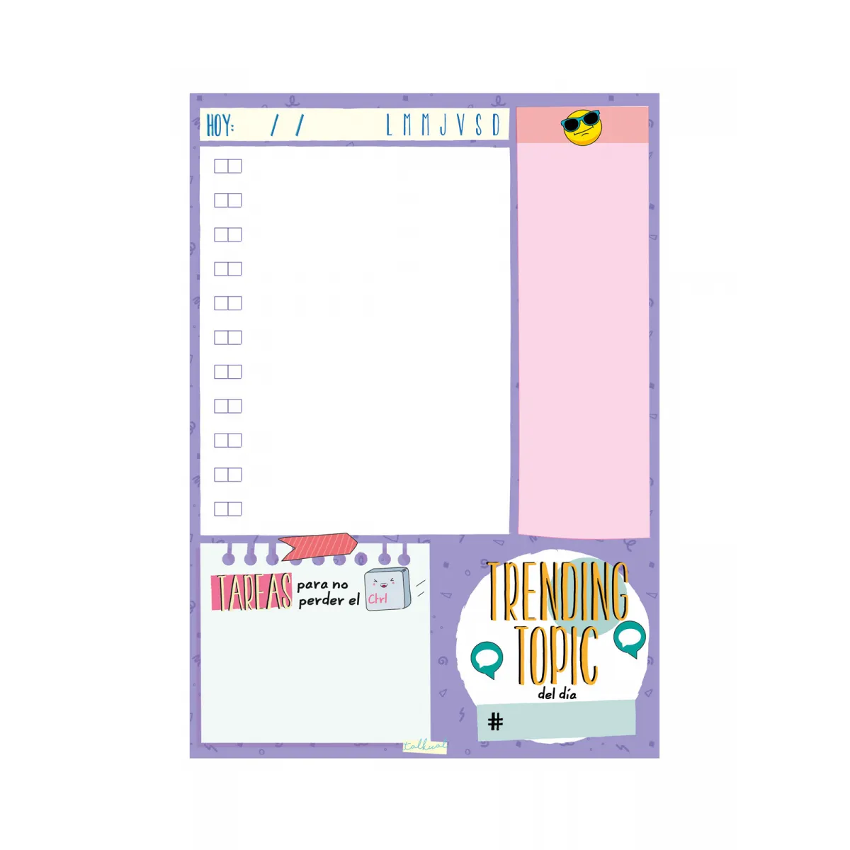 Mi planificación diaria de los estudios y del trabajo Planificador diario TALKUAL para chicas naturales, diferentes y únicas como tú que necesitan planificar sus días caóticos de estudio y/o trabajo. Encolado en la parte inferior para arrancar fácilmente. En el interior encontrarás cuatro diseños de página distintos. Papel de calidad de 90 g/m2. En este planificador tendrás espacio diario para concretar horario o indicar la prioridad de todas las tareas y compromisos del día. También dispondrás de un espacio extra para actividades que tienen varias tareas asociadas. Ya no tendrás excusa para no planificarte o, al menos, te ayudará a ser un pelín más organizada... ¡Cualquier ayuda es poca! Muéstrate #Talkual, #talkualsoy. Somos TALKUAL. Características destacables: Los artículos Finocam es