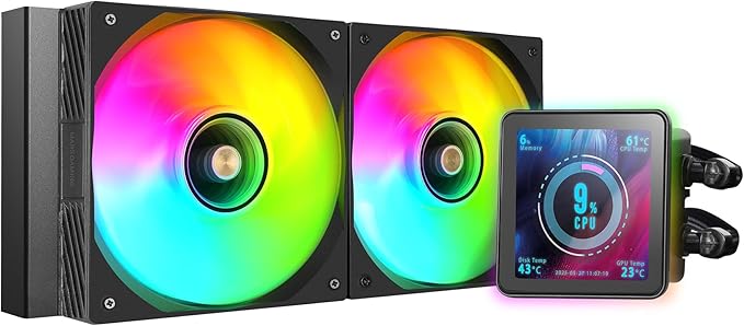 | Características | - Iluminación - Voltaje: 12V DC / 0.45A - Conector: 3 pin - Tamaño: 240mm - Resolución: 480x480 pixeles - Ángulo de visión: 178º - Tipo de panel: IPS - TDP: 500W - Socket: INTEL LGA 2066/2011/1851/1700/1366/1200/1156/1155/1151/1150 y AMD AM5/AM4 - Nivel sonoro: 9-26 dBA - Nº de ventiladores: 2 - Material Radiador: Aluminio - Longitud / Material Tubos: 360mm / Teflon - Velocidad ventilador: 800-2300 ± 10% RPM - Voltaje / Corriente ventilador: 12V DC / 0.15A - Flujo de aire: 27.2-76.6 CFM - Conectores iluminación: Addressable RGB +5V 3 pin + VDG 3 pin - Iluminación ARGB - Velocidad bomba: 3300 RPM±10% - Conector Ventilador: PWM 4 pin - Voltaje / Corriente Iluminación: 5V DC / 0.25A Dimensiones y peso Bomba: - 70 x 70 x 62 mm Radiador: - 275 x 120 x 27 mm - 1189g |