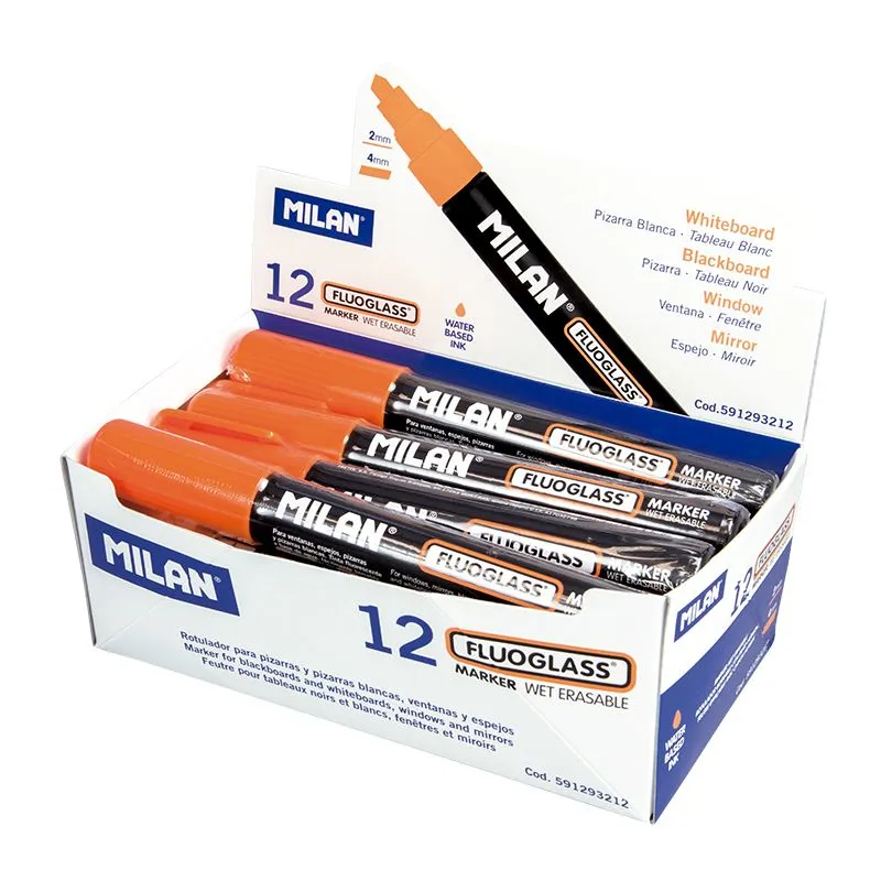 Milan Fluoglass Rotulador Superficies Lisas - Punta Biselada - Trazo De 2 - 4Mm - Tinta Al Agua - Borrado Facil - Color Naranja