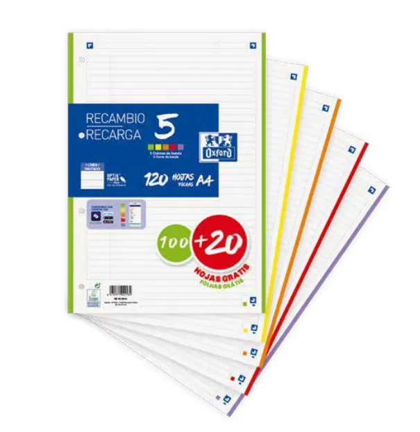 Recambio OXFORD retractilado en paquete de 120 Hojas (100+20) con 5 colores de banda y 4 taladros de archivo para poder guardar las hojas en un archivador o carpeta de anillas. Ideal para quienes prefieren hojas sueltas y llevar sólo las que necesiten. Puedes organizarte para utilizar un color por asignatura o tema. Compatible con la app gratuita SCRIBZEE que permite organizar, consultar, compartir y acceder a tus notas en cualquier lugar desde tu Smartphone, tablet o PC. A DESTACAR: Promoción 100 + 20 hojas gratis. Papel OptikPaper: un papel exclusivo de Oxford único por su opacidad, lisura y satinado. La tinta no traspasa de un lado a otro ni se dispersa, resistente a la presión del lápiz y al borrado. Permite la escritura en ambas caras de la hoja. 5 bandas de color ideal para la clasi