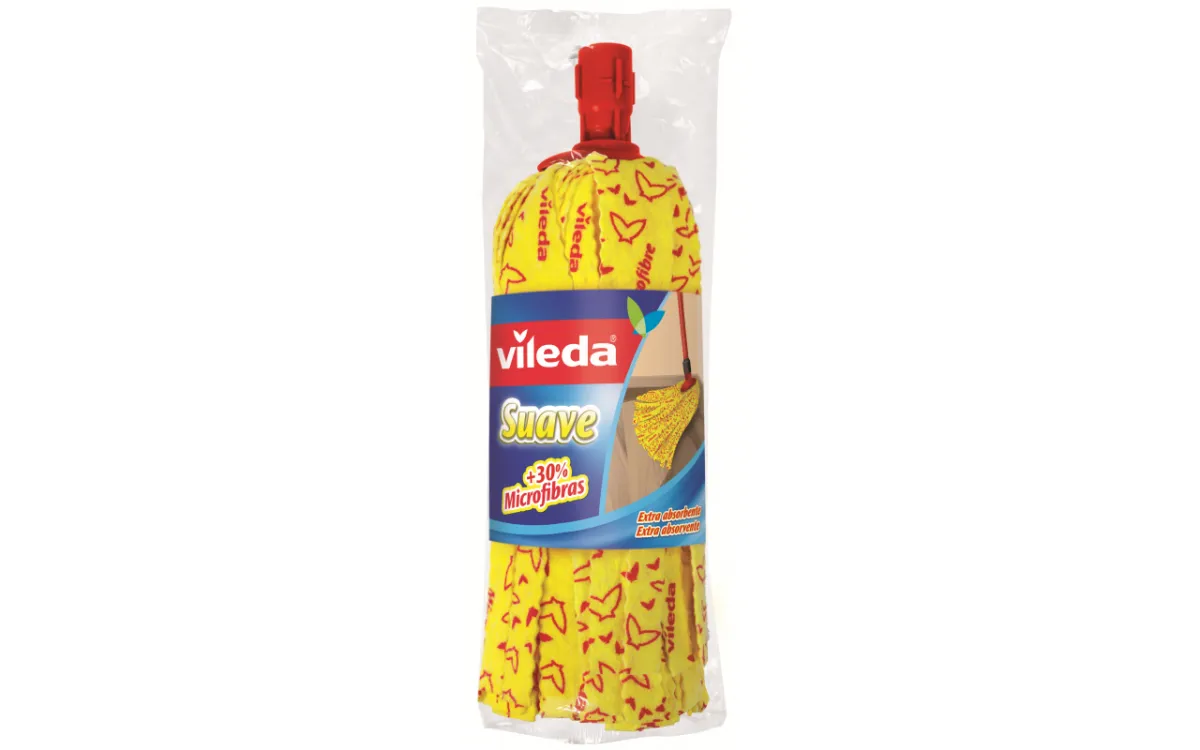 Fregona Suave de Vileda, máxima absorción y resistencia: - Incorpora un 30% de microfibras que incrementa la capacidad de absorción y limpieza. - Composición de fibras ricas en algodón aportan una absorción extra, haciéndola ideal para usar en superficies delicadas. - Cabezal limpia-rincones, exclusivo de Vileda, para acceder y limpiar fácilmente esquinas y rincones. - Anclaje universal apto para cualquier palo. - Lavable hasta 60°, peso 0.13 Kg, medidas: 8 x 28 x 8 cm, color amarillo.