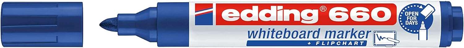 Marcador de pizarra blanca para escribir y marcar sobre pizarras blancas y también adecuado para flipcharts. El texto escrito se puede borrar en seco de prácticamente todas las superficies no porosas, tales como esmalte y melamina. El grosor de trazo de la punta redonda es de 1,5-3 mm. Gracias a la tecnología cap-off, el producto no se seca aunque se deje sin la tapa puesta durante varios días (prueba climática según ISO 554). La tinta del marcador para pizarras blancas es resistente a la acción de la luz y de secado rápido. Artículo disponible en los colores negro, rojo, azul y verde. El producto es rellenable con la tinta de recarga edding BTK 25. Sin adición de butilacetato.