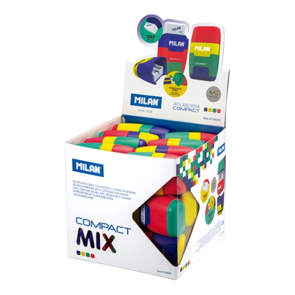 Combinación de goma de borrar y sacapuntas doble (uno estándar y otro MAXI) con depósito. Diseño COMPACT edición Mix. Goma cuadrada suave de caucho sintético tipo 'miga de pan'. El sacapuntas dispone de una cuchillade acero afilada y resistente, ideGpara todo tipo de lápices. Sacapuntas con cuchilla de seguridad: este sistema evita que se pueda separar la hoja del cuerpo del sacapuntas. 4 colores surtidos: rojo, verde, amarillo y azul. Diseño original creado por el departamento de I+D de MILAN.Gomas de recambio disponibles (modelo 430).
